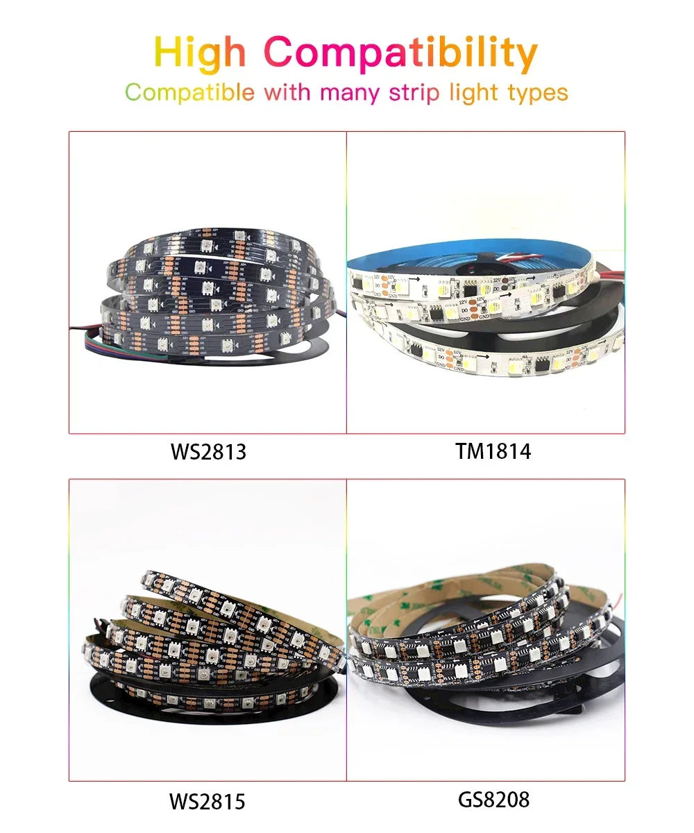 Multiple Light Strip Compatibility: This controller is compatible with various types of light strips, such as WS2811, WS2812, SK6812, TM1814, WS2813, WS2815, and more. Regardless of what type of light strip you have, it can easily be paired with this controller.